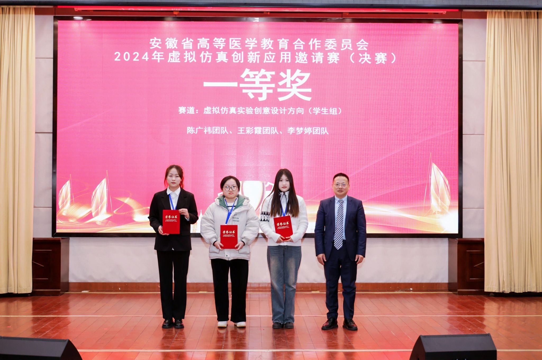 为进一步深化实验教学改革,加快推进虚拟仿真技术在实验教学的应用,促进多学科交叉融合,12月28日,由安徽省高等医学教育合作委员会主办、安徽医科大学承办的安徽省2024年虚拟仿真创新应用大赛在合肥举办,副院长文育锋带队参加比赛。经专家评审和现场答辩,我校师生凭借扎实的专业功底、创新的设计理念以及出色的现场发挥,从来自全省相关院校的35支参赛队伍中脱颖而出,获一等奖2项(其中教师组1项、学生组1项)、二等奖5项、三等奖2项。