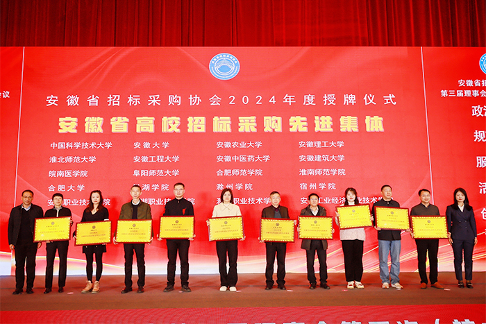 近日,2024年度安徽省高校采购论坛在合肥召开。会上表彰了全省高校招标采购工作中表现突出的先进集体与个人,我校获“2024年度安徽省高校招标采购先进集体”称号,国资处赵秀芳和何劲草2名老师获“2024年度安徽省高校招标采购先进个人”称号。