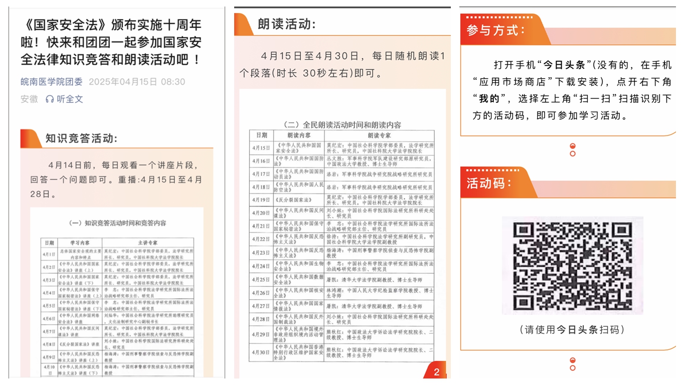 线上活动激发学习热情。学校开展“全民国家安全教育,走深走实十周年”线上征文活动,鼓励学生分享对国家安全教育的认识、体会和感悟,或通过案例阐述国家安全的重要性及维护方法,引导学生树立正确的国家安全观;组织学生参加《国家安全法》颁布实施十周年全民国家安全法律知识线上竞答和朗读活动,掀起学习国家安全教育知识的热潮,让国家安全意识深入人心。