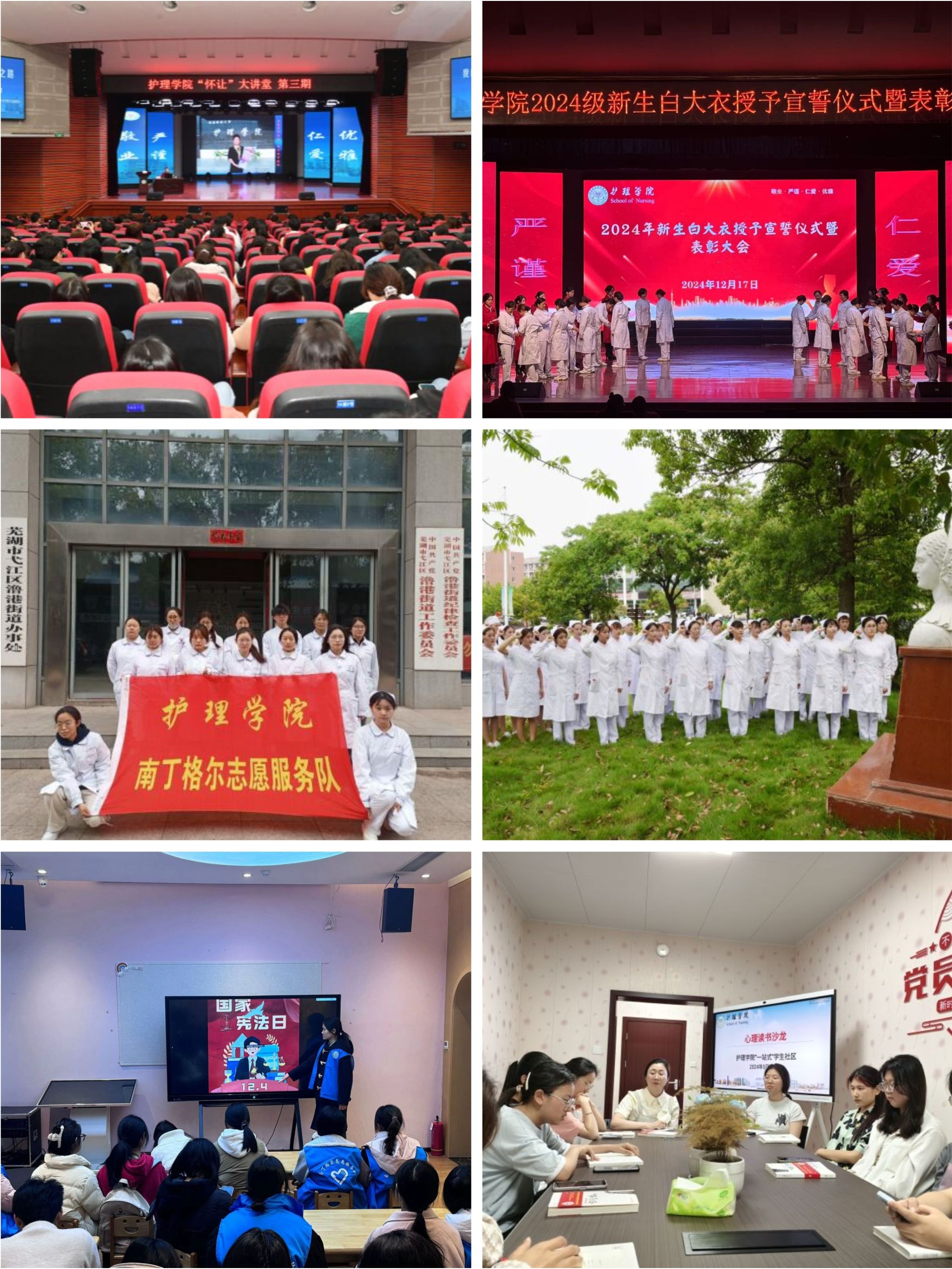 发挥党建引领作用,学院党委获首批“全省党建工作标杆院系”,获批“样板支部”培育创建单位省级1个、校级3个,为学院事业高质量发展提供有力政治保证。坚持用习近平新时代中国特色社会主义思想铸魂育人,坚持立德树人根本任务,多措并举加强思想政治教育。构建“四个理论学习平台”:党委理论学习中心组学习、“三会一课”、教职工理论学习会、党章和团章“双学”小组,同时利用学习强国、青年大学习开展线上理论学习。学院师生获省第七届学生“学宪法、讲宪法”演讲比赛高校组一等奖,“学党史、强信念、跟党走”第四届全省“微团课”评选特等奖,省大学生学习马克思主义理论成果大赛二、三等奖各1项。学生1件作品入选第九届高校廉洁教育系列活动遴选名单,也是省内高校入选四件作品之一。打造“五个思政教育品牌活动”:“怀让”大讲堂、本科生“三全”导师制、“5•12”国际护士节系列活动、白大衣授予暨宣誓仪式、星级优良学风班评选。拓展“六个实践育人载体”:护理临床技能大赛、“天使杯”护理操作技能比赛、微格教学比赛、护理科研试验站、“南丁格尔”志愿服务、社会实践。同时,坚持以文化人,依托学校现有的全国“终身学习品牌项目”、国家级“大思政课”实践教学基地等优质思政资源,加强医者仁心教育,砥砺学生职业道德情操。