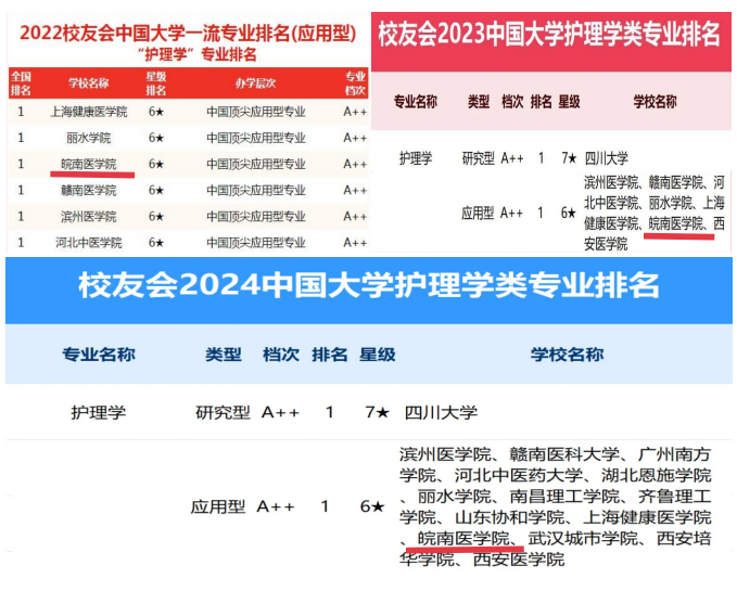 近年来,护士执业资格考试首次通过率稳定在99%以上,护理学专业学生毕业率100%,学位授予率99%以上,就业率保持在97%左右。在校友会中国大学一流专业排名“护理学类”专业排名中,2022-2024年连续三年位列应用型第一方阵6星A++。