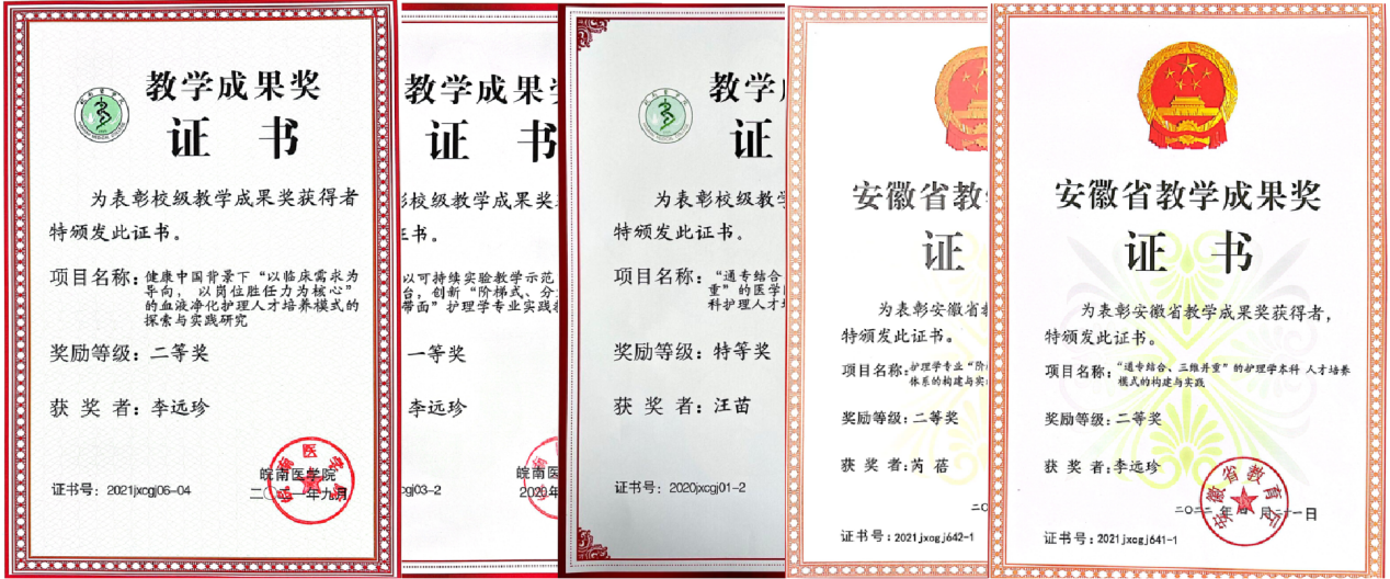 学生在全国首届、第二届护理学专业本科临床技能大赛中先后荣获三等奖、二等奖;2021年获第十届全国大学生技能比赛华东片区赛二等奖;2021年、2024年在安徽省第一、二届护理院校本科学生临床技能竞赛均获团体一等奖,共获9个单项奖;2024年在安徽省第二届正常分娩接产技能大赛中获院校组团体一等奖。