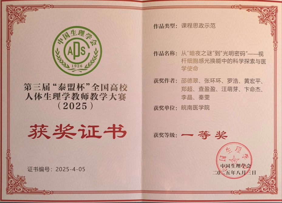 在围绕人工智能(AI)赋能生理学教学的主旨报告环节,我校汪萌芽教授受邀共同主持,与专家学者深入交流。会议第二日举行“泰盟杯”教学大赛颁奖庆典,我校邵德翠团队在全国近70所参赛医学院校中脱颖而出,荣获“课程思政示范”一等奖,彰显了我校生理学课程思政教学模式获国内同行高度认可,具有引领示范作用。